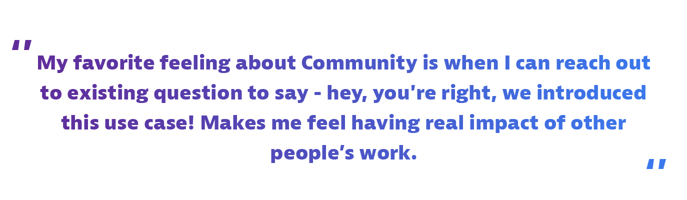 Most of my work is hidden in internal engines, here in Community I can reach out to people using our software and learn what are their needs and problems. It helps me understand a bigger view outside my daily job.