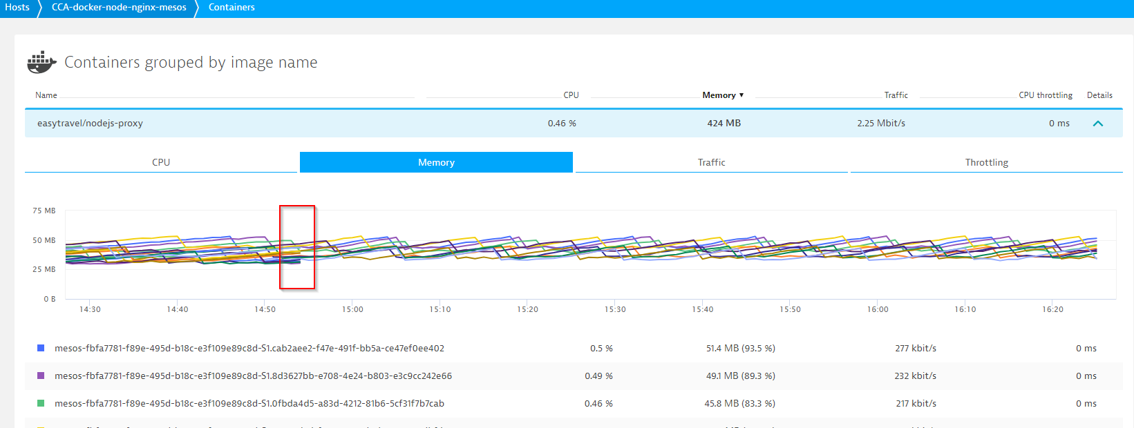 When hovering over the graph all details for CPU, Memory, Traffic and CPU Throttling are shown also for stopped containers for the selected time.