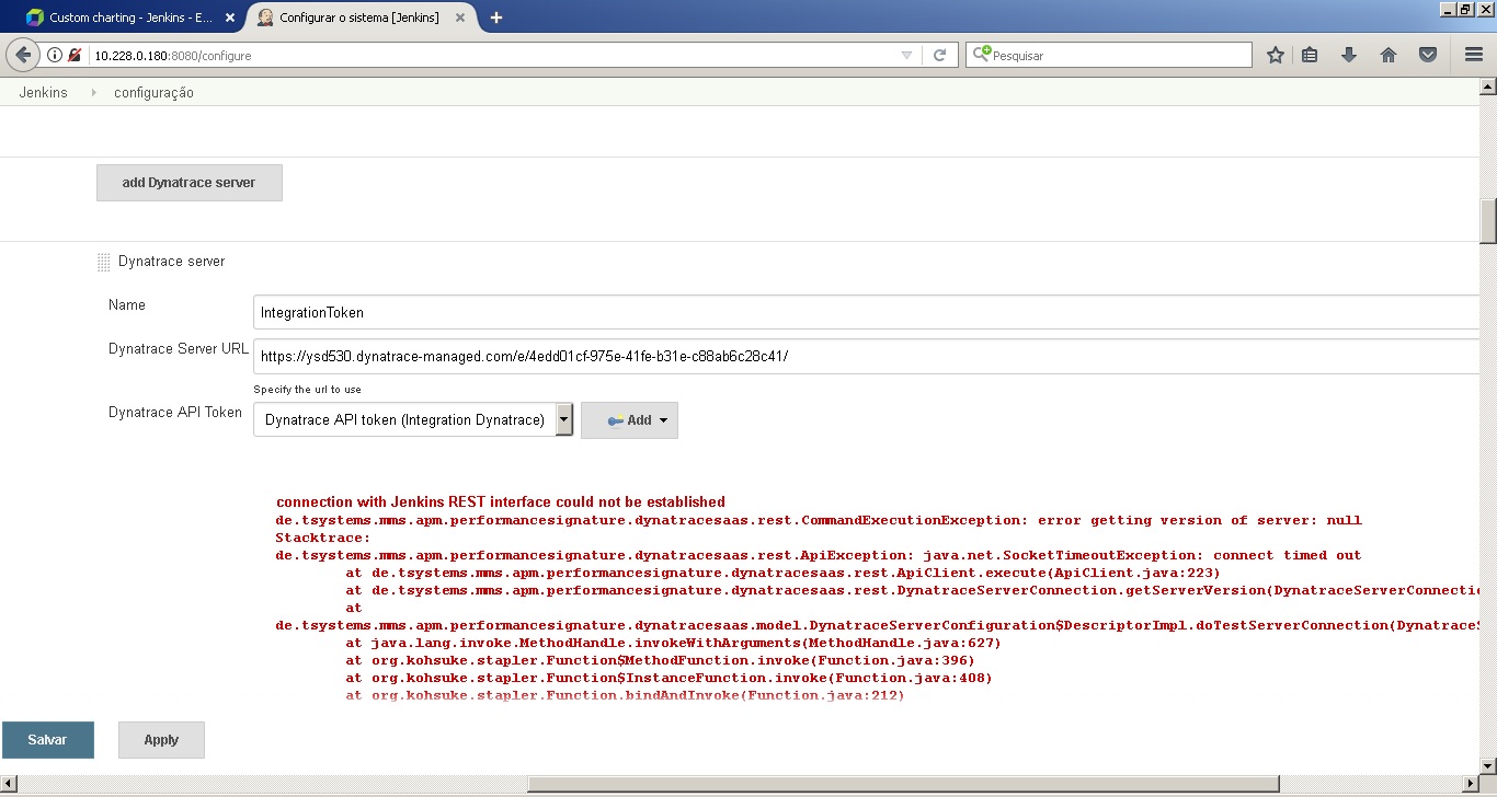 Hi All. A Connection TImeout indicates that your Jenkins Instance is not able to open a network connection to that Dynatrace Server URI Endpoint. I would logon to that machine where Jenkins runs and try a CURL to validate that there is no firewall blocking Jenkins from accessing this URL