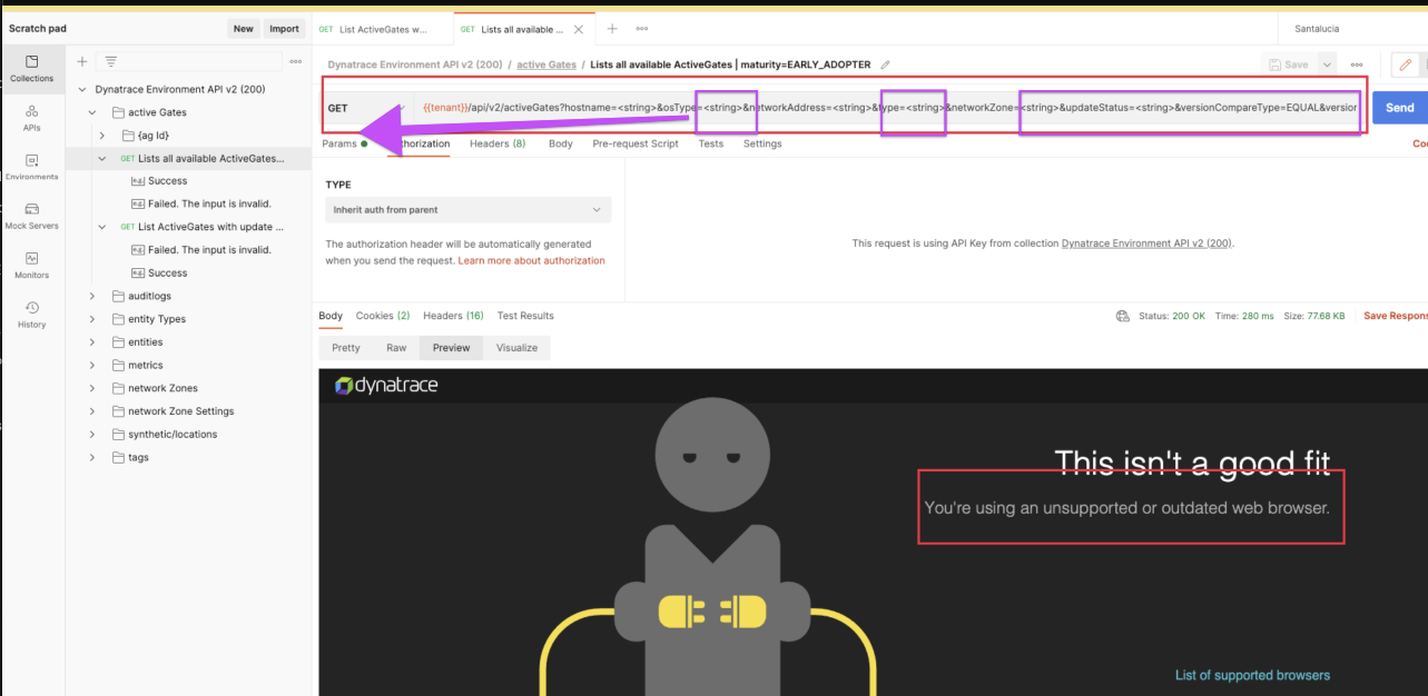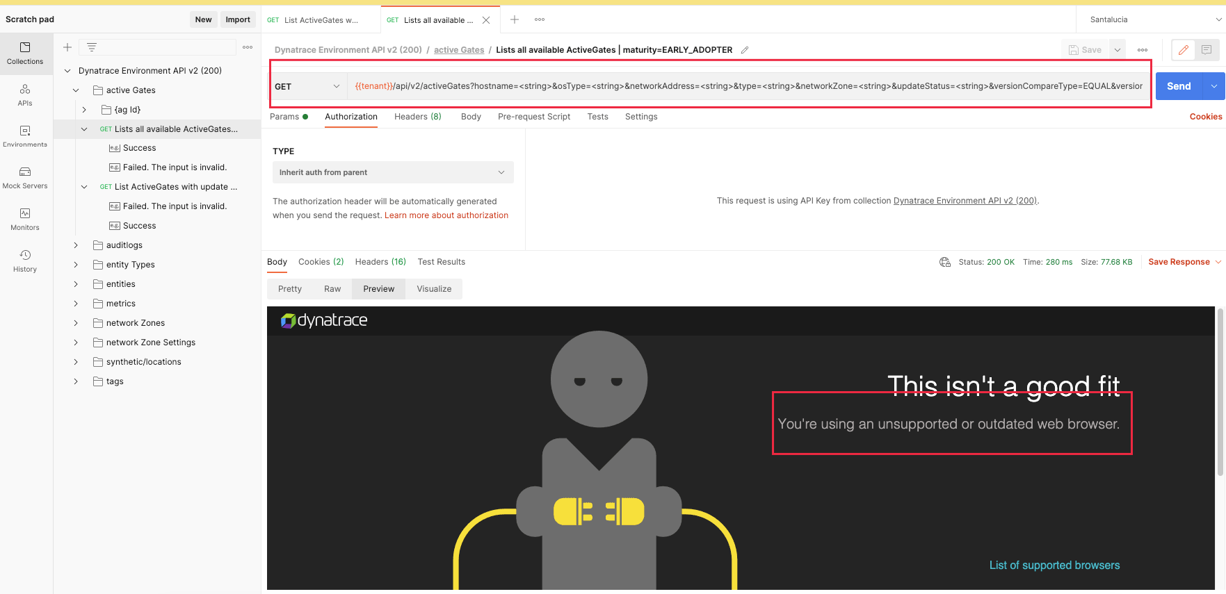 I got an error using Postman, I hope you handled it before and know how to solve it. The thing is that I'm trying to connect the latest version of Postman (8.0.4) using Dynatrace GitHub Collections (https://github.com/sergiohinojosa/dynatrace-api-postman-collections) to Dynatrace API. I have created env variables to resolve the DT tenant and API-Token. The problem comes when I run the request, I am getting the message "Unsupported web browser ":