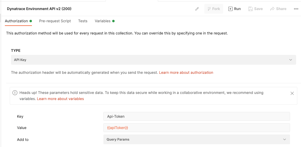 As a side note: Regarding passing the Token, both methods are accepted. You can pass it as a Header or a Query parameter. Recommended is always as a header parameter. The collection has it as query since sometimes is needed to access Dynatrace behind reverse-proxyy. A reverse-proxy normally strips down the header, and the query won't be stripped down. On the down side, a query parameter might be stored on the audit log of the webserver, so something to keep in mind.
