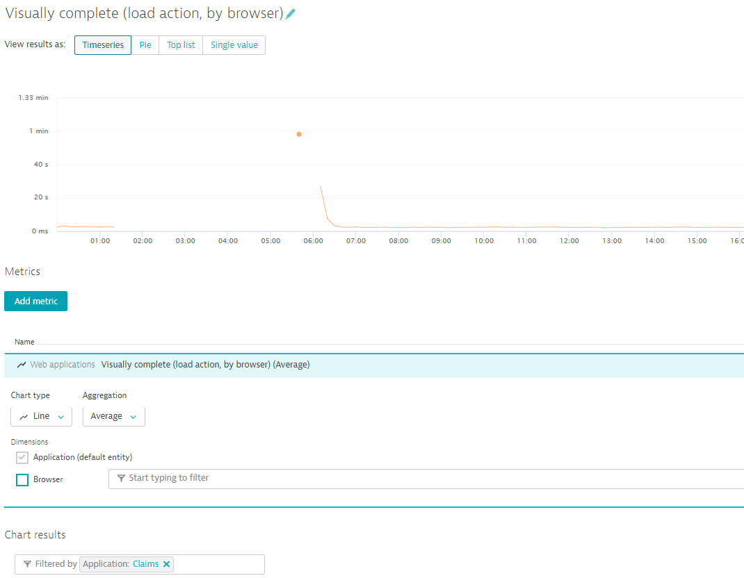 USQL has been helpful if I want to get a median or average response time by city, but I don't see a way to use it to chart out response times over time for an individual city. I want to know if the Claims Application is slower for users at 1PM vs 2PM in Alpharetta (preferably on a line chart), not the average visually complete time for that office over the past 30 days. Is there a way to get it to show me the information on a timeline for Alpharetta?