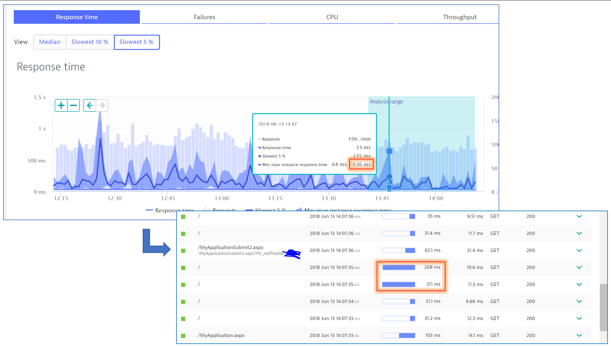 In chart, the max is around 600ms; in purepath list, the max is 200ms.